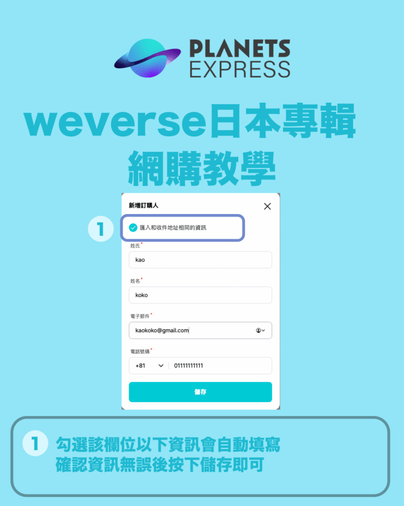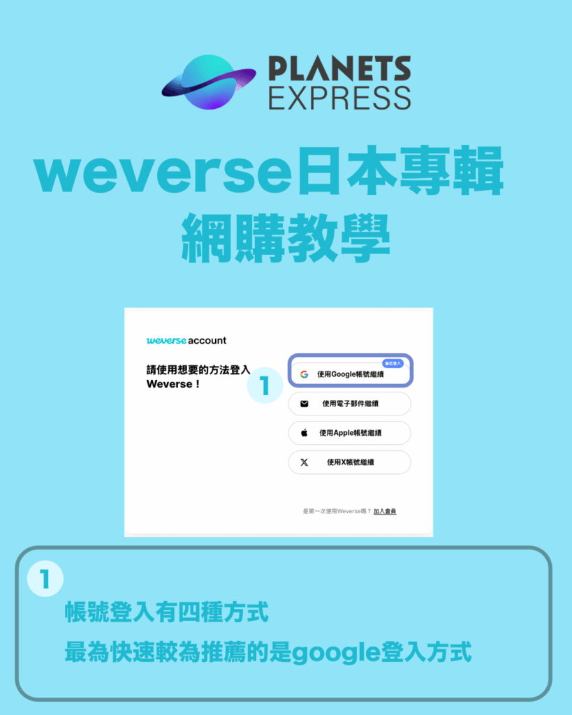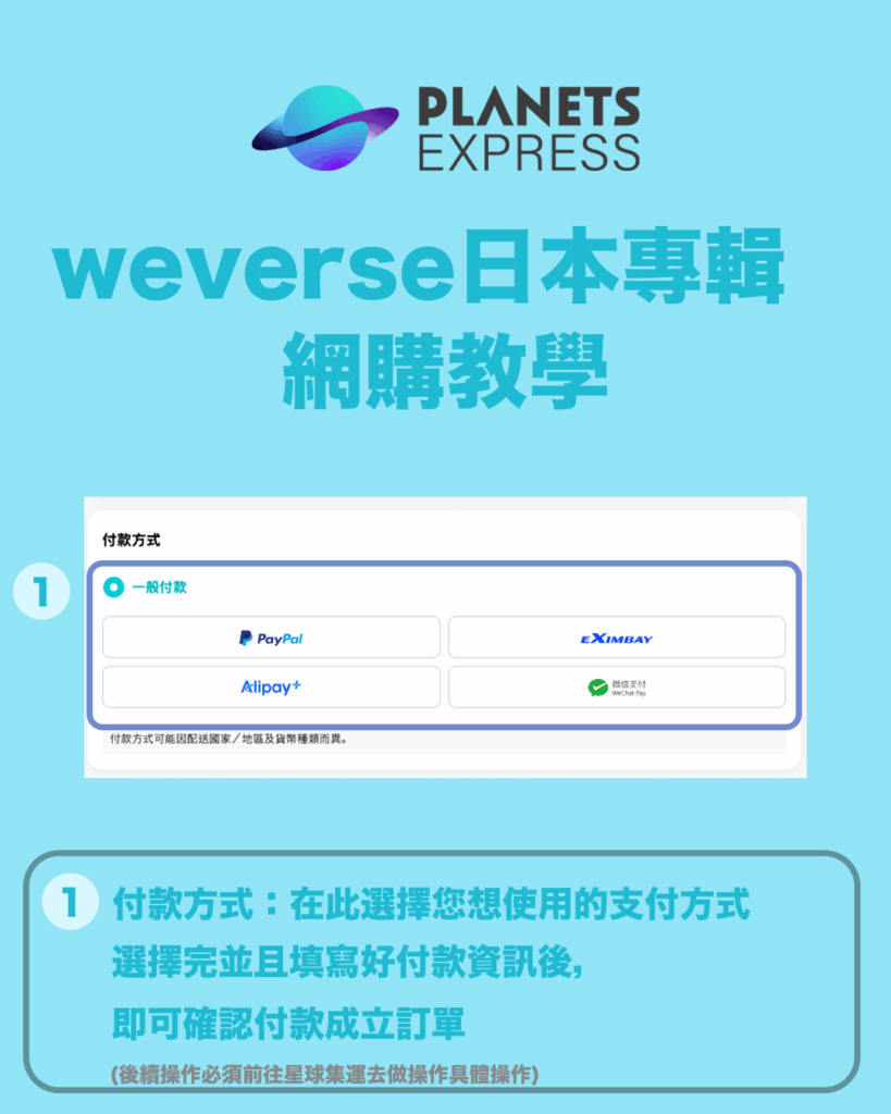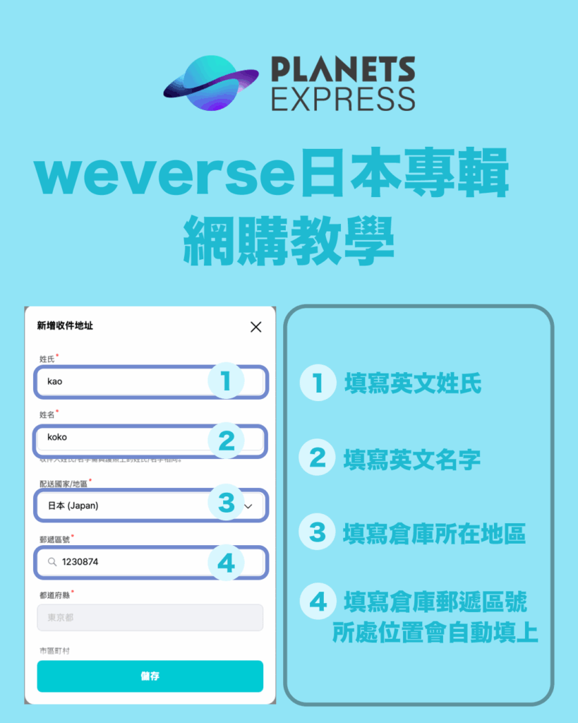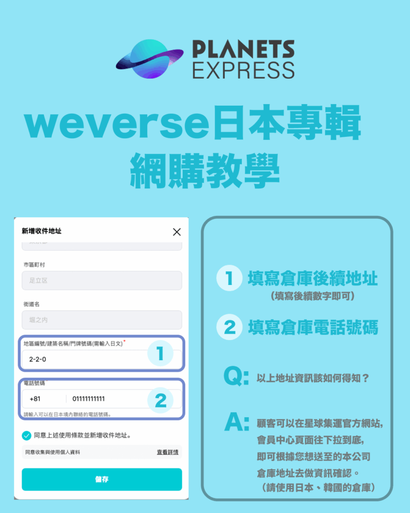 【日本網購教學】日本weverse 購物教學註冊、購買、下單流程海外購物教學 / 8 10 月, 2025 點擊下列按鈕即可跳轉至本文章相關教學位置 購買流程介紹 地址填寫範例 日本倉儲位置 集運下單流程 身為一個追星的台灣粉絲,你是否會有入手日韓偶像周邊或是特典的需求呢但是實際下單後卻發現光運費就高的離譜,又或是根本沒辦法寄出海外,這樣的困擾想必遇到了會很麻煩吧,本公司星球集運的服務就是為了解決您的煩惱而存在的,接下來我們就會好好說明該如何使用本公司的服務,請耐心看完,我們相信您一定會有所收穫不用緊張,在這一篇的weverse韓國專輯購物教學裡面,我們會十分詳細的從頭開始教學,雖說詳細,但實際操作下來也是很簡單的,跟著這篇文章一起讀下去你就會一步步變成專輯購物達人囉! 以下為weverse日本區 註冊至購買的圖解與說明 首先先進入weverse官網(下列網址:https://shop.weverse.io/zh-tw/home)可以先從圖上找到相關標注與解釋標註1:您能夠點擊該位置先行改成ZH 中文翻譯、後續操作會較為輕鬆喔!此外修改成中文後可以看到,標註2:該位置上有一個地址,您可以改至KR接著填入本公司的韓國地址,請注意若尚未填寫收件地址是不能夠購物的,因此您可先把這篇教學文章往下拖動,先找到星球集運的倉庫位置如何查看,在進行後續操作!標注3:此為登入畫面,點擊該按鈕即可選擇登入方式 進行帳號的登入或註冊 若您是第一次使用該網站的話,點擊標注3的地方會有會員登錄與加入會員兩個選項請先用google、蘋果、其他電子郵件去申辦會員帳號,申辦帳號完成後再點擊登入會員,即可從圖上4個選項擇一登入,此外最為推薦的是google帳號登入,步驟相比其他方式較為少一些。 商品購買介面介紹 於weverse首頁挑選想要購入的商品後即可進入該畫面。標註1:您可以在該標記處確認您要購買的產品數量以及價格(不過有時需注意購買會有上限)標注2:您可以根據自己的購買需求決定是否要稍後再結帳,若您還有想入手的商品可以先點選放入購物車,反之則可以直接按下購買按鈕進行後續的操作以及結帳。 地址填寫範例介紹 若已經確認好欲購買的商品後會進入到最終確認頁面,在此頁面把最後所需填寫資料填完之後,訂單就算正式成立囉! 訂購人資訊 確認支付方式 頁面最下面會要您填寫支付方式,此為最後一個欄位,只要您決定好支付方式並且填寫完必要資訊後,該訂單就可以算是正式完成,接下來就只需要前往星球集運官網完成最後的步驟而已了! 星球集運倉儲位置 (下列網址:https://planets.com.tw)在執行購買操作前,請先至星球集運官網填寫申辦會員也可以用google帳戶直接登入。 後續操作需要於星球集運官方網站進行,下列是操作介紹,包括預報包裹、委託集運選擇運送方式、加購包材等等後續操作。 星球集運操作教學 STEP1 取得倉庫資訊 加入會員後,即可取得倉庫資訊,並照資訊填入您在商家的收件欄位。 (收件人姓名沒有強制要求。 地址後方務必加入會員編號。) STEP2 開始購物 於海外宅配資訊欄位填寫倉庫地址。 (地址務必包含會員編號) (推薦!) 綁定 LINE 個人化服務 即時接收入庫/付款/物流追蹤通知! LINE 官方帳號:@planets_express(須加@) https://lin.ee/R4anhHx STEP3 預報包裹 賣家出貨後,獲得海外宅配單號後,於會員中心填入相關資訊。 STEP4 打包回台 包裹管理頁面可以看到您的所有包裹,寄回台灣時請點擊''委託集運'',即可選擇包裹打包方式及相關服務。 (送出後即無法再次修改內容或要求二次打包。) STEP5 支付款項 申請打包後兩個工作天內*即可檢視費用,支付後即坐等收貨! Facebook Line Instagram 日本集運推薦 🚢 海運 120$/kg✈️ 空運 210$/kg (包稅)✈️ 空運(經濟型) 235$/kg (包稅) 免費加入會員!