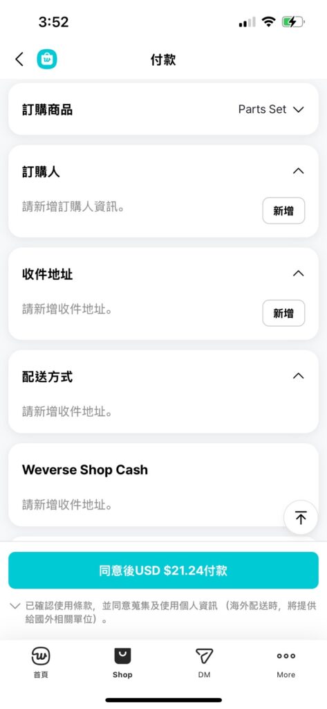 【韓國網購教學】韓國weverse 購物教學註冊、購買、下單流程海外購物教學 / 7 10 月, 2025 APP/手機➡️ APP/手機⬇️ 購買流程介紹 地址填寫範例 韓國倉儲位置 集運下單流程 電腦版/網頁➡️ 電腦版/網頁⬇️ 購買流程介紹 地址填寫範例 韓國倉儲位置 集運下單流程 身為一個追星的台灣粉絲,你是否會有入手日韓偶像周邊或是特典的需求呢但是實際下單後卻發現光運費就高的離譜,又或是根本沒辦法寄出海外,這樣的困擾想必遇到了會很麻煩吧,本公司星球集運的服務就是為了解決您的煩惱而存在的,接下來我們就會好好說明該如何使用本公司的服務,請耐心看完,我們相信您一定會有所收穫不用緊張,在這一篇的weverse韓國專輯購物教學裡面,我們會十分詳細的從頭開始教學,雖說詳細,但實際操作下來也是很簡單的,跟著這篇文章一起讀下去你就會一步步變成專輯購物達人囉! 以下為weverse日本區 註冊至購買的圖解與說明(手機版) 首先先至google-play / app-store下載weverse官方應用程式,等待下載完成後開啟進入登入畫面,接著就可以選擇自己偏好的登入方式選擇登入方式。 登入帳號進入首頁頁面,您可以在此處添加您想關注的偶像或是團體,可以隨時透過通知了解是否有新的活動要舉行,或有新品周邊要進行推出,若您是想要購買相關產品,請點擊畫面上標注起來的位置切換至商店頁面。 此處為商品頁面,您可以在此處看到目前正在舉辦活動、或是預告商品販售的團體或是明星周邊,若您有特定想要搜尋的人物團體,可以至標記處點擊,進入輸入頁面後,直接搜尋關鍵字即可。 此處以該商品為例,在您點進商品詳細資訊前,您會在商品的預覽圖看到其中一個標籤為:該商品是否是從韓國出貨,其中也包括來自日本的偶像、團體,因為現今weverse基本上大多數的商品都是從韓國境內出貨,因此在後續成立訂單到了要填寫地址的步驟時,建議您選擇本公司的韓國倉儲作為收件地址。在您選定確認過要購買的商品資訊無誤後,即可按下購買按鈕進行下一步,包含填寫地址、確認收件人等操作。 按下購買商品按鈕後,會跳轉到該畫面,在此處,您需要填寫包括:訂購人資訊、收件地址(本公司倉儲地址)、配送方式、等等必填欄位,最後在決定使用何種方式支付,該筆訂單才會正式成立!詳細地址填寫方法:可以至星球集運的官方網站⮕畫面右上角會員中心⮕下拉畫面到底觀看本公司服務區域的所有倉儲位置。 (例如韓國、日本等等)也可以參考下方文章,或是利用上方跳轉按鈕,直接查詢如何填寫本公司的地址、電話等等必需填寫的訂購資訊的圖解。等訂單確認成立後,即可以前往星球集運建立運單,讓本公司來替您接手回國事宜!(具體建立運單教學可以從此文章至頂處按鈕進行跳轉觀看圖文教學) 以下為weverse韓國區 註冊至購買的圖解與說明(網頁版) 首先先進入weverse官網(下列網址:https://shop.weverse.io/zh-tw/home)可以先從圖上找到相關標注與解釋標註1:您能夠點擊該位置先行改成ZH 中文翻譯、後續操作會較為輕鬆喔!此外修改成中文後可以看到,標註2:該位置上有一個地址,您可以改至KR接著填入本公司的韓國地址,請注意若尚未填寫收件地址是不能夠購物的,因此您可先把這篇教學文章往下拖動,先找到星球集運的倉庫位置如何查看,在進行後續操作!標注3:此為登入畫面,點擊該按鈕即可選擇登入方式 進行帳號的登入或註冊 若您是第一次使用該網站的話,點擊標注3的地方會有會員登錄與加入會員兩個選項請先用google、蘋果、其他電子郵件去申辦會員帳號,申辦帳號完成後再點擊登入會員,即可從圖上4個選項擇一登入,此外最為推薦的是google帳號登入,步驟相比其他方式較為少一些。 商品購買介面介紹 於weverse首頁挑選想要購入的商品後即可進入該畫面。標註1:您可以在該標記處確認您要購買的產品數量以及價格(不過有時需注意購買會有上限)標注2:您可以根據自己的購買需求決定是否要稍後再結帳,若您還有想入手的商品可以先點選放入購物車,反之則可以直接按下購買按鈕進行後續的操作以及結帳。 地址填寫範例介紹 若已經確認好欲購買的商品後會進入到最終確認頁面,在此頁面把最後所需填寫資料填完之後,訂單就算正式成立囉! 訂購人資訊 確認支付方式 頁面最下面會要您填寫支付方式,此為最後一個欄位,只要您決定好支付方式並且填寫完必要資訊後,該訂單就可以算是正式完成,接下來就只需要前往星球集運官網完成最後的步驟而已了! 星球集運倉儲位置 (下列網址:https://planets.com.tw)在執行購買操作前,請先至星球集運官網填寫申辦會員也可以用google帳戶直接登入。 後續操作需要於星球集運官方網站進行,下列是操作介紹,包括預報包裹、委託集運選擇運送方式、加購包材等等後續操作。 星球集運操作教學 STEP1 取得倉庫資訊 加入會員後,即可取得倉庫資訊,並照資訊填入您在商家的收件欄位。 (收件人姓名沒有強制要求。 地址後方務必加入會員編號。) STEP2 開始購物 於海外宅配資訊欄位填寫倉庫地址。 (地址務必包含會員編號) (推薦!) 綁定 LINE 個人化服務 即時接收入庫/付款/物流追蹤通知! LINE 官方帳號:@planets_express(須加@) https://lin.ee/R4anhHx STEP3 預報包裹 賣家出貨後,獲得海外宅配單號後,於會員中心填入相關資訊。 STEP4 打包回台 包裹管理頁面可以看到您的所有包裹,