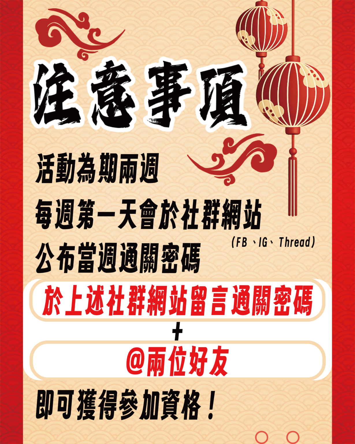 1.中獎名單將於每週活動截止後之隔週一,統一公布於本公司官方社群媒體平台(Facebook、Instagram、Threads)。